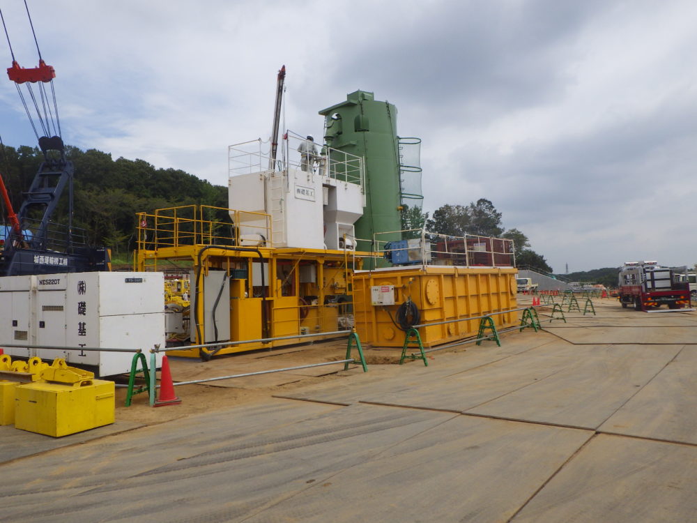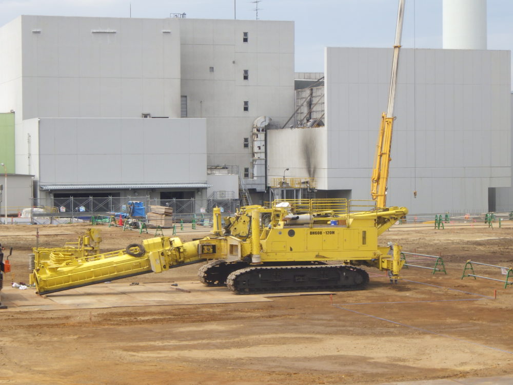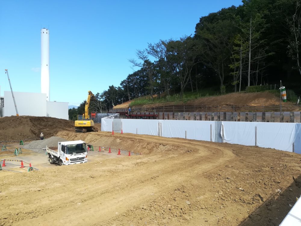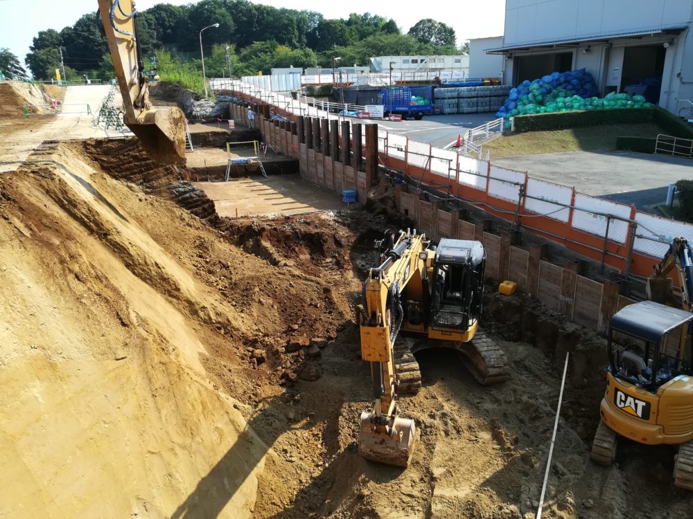 2018.09.1 現場写真 現場状況(2018年8月) ①造成工事状況(8月上旬) (敷地周囲の擁壁工事を引き続き行っています) ②造成工事状況(8月上旬) ③造成工事状況(8月下旬) ④工場棟建築工事状況(8月中旬) (新しい工場を建てる敷地が完成しました) ⑤工場棟建築工事状況(8月末) (基礎工事(山留工事)用の仮設設備・重機の準備を行いました) ⑥工場棟建築工事状況(8月末)