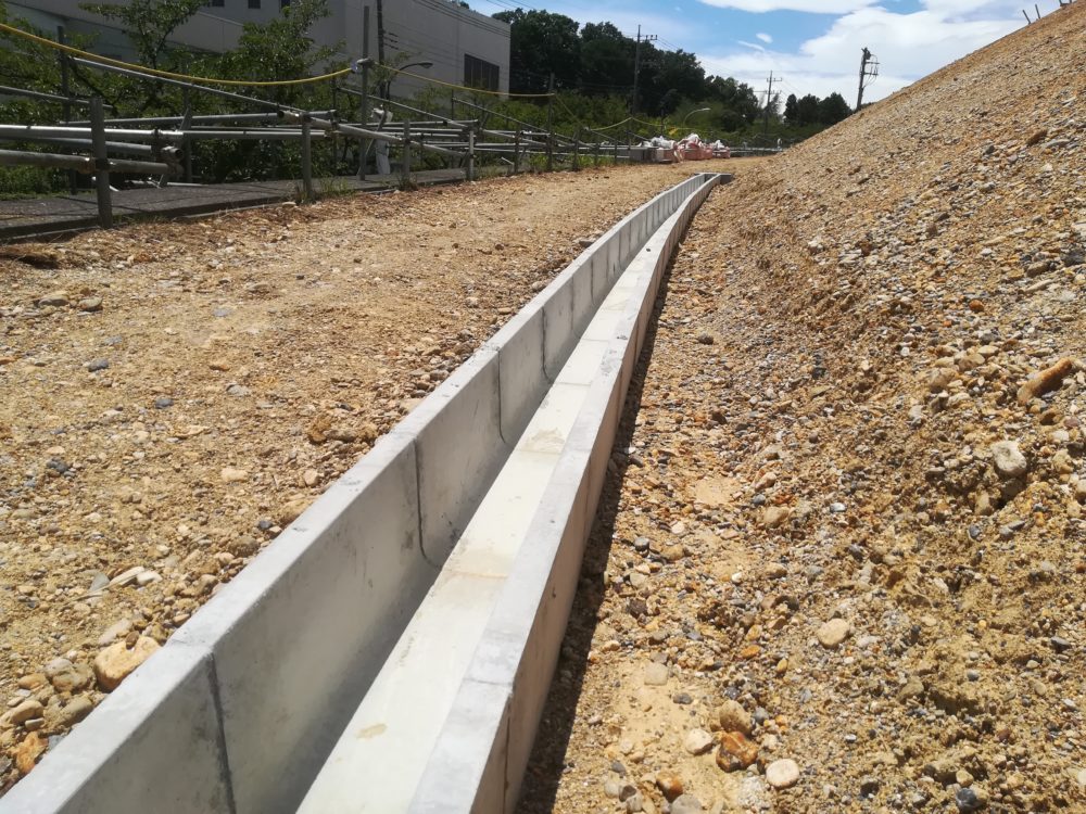 2018.07.1 現場写真 現場状況(2018年6月) ①既存管理棟解体工事状況(6月下旬) (杭の引抜きが完了し、整地を行いました) ②造成工事状況(6月上旬) ③造成工事状況(6月下旬)(掘削後の法面には、排水溝を順次設置しています) ④造成工事状況(6月上旬)(擁壁を支える杭の杭孔を大型のドリルで掘削します) ⑤造成工事状況(6月上旬) ⑥造成工事状況(6月下旬)(鉄筋を組んでコンクリートを打設し、擁壁を造ります)