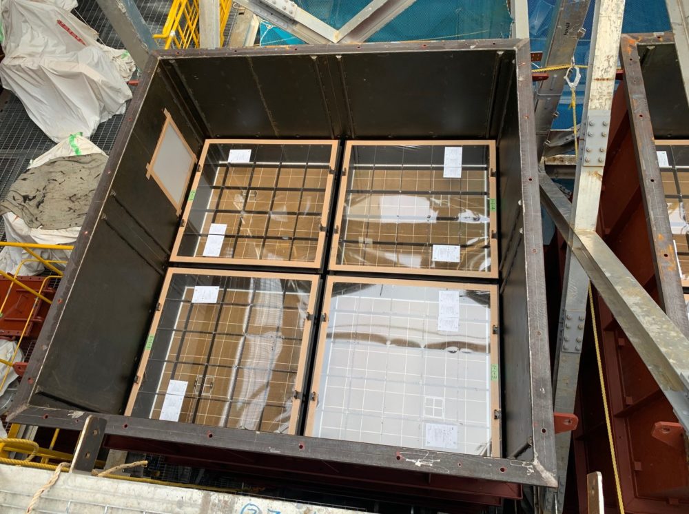 (触媒反応塔[排ガス中の窒素酸化物・ダイオキシン類を除去する装置]を据付しました[写真は機器内部の触媒を写しています])