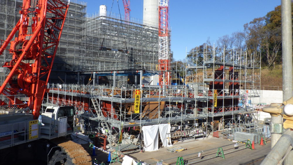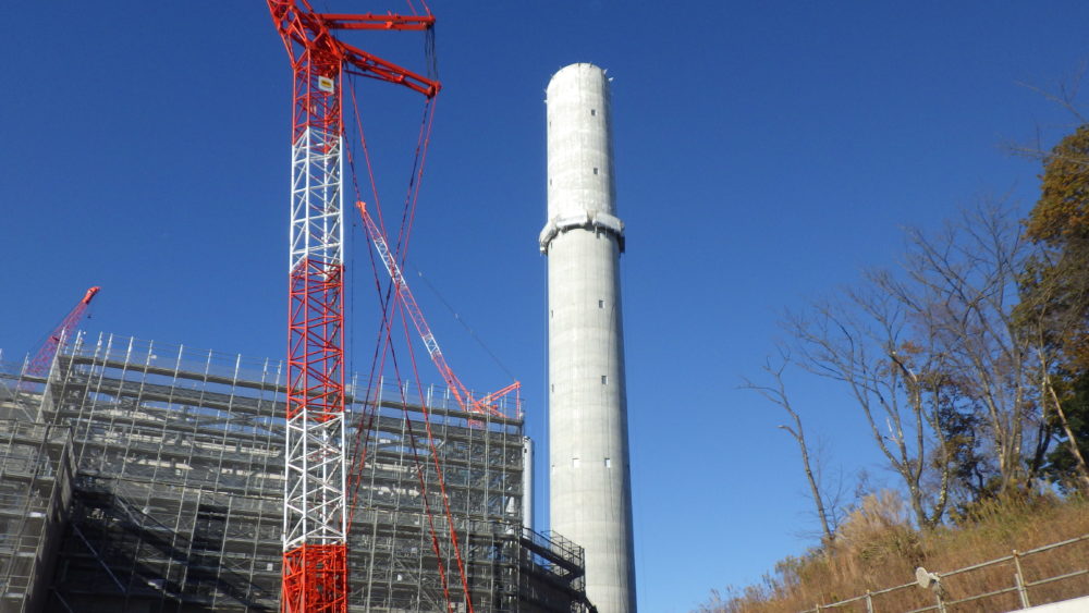 (煙突工事が概ね完了し、これから塗装工事に着手します)