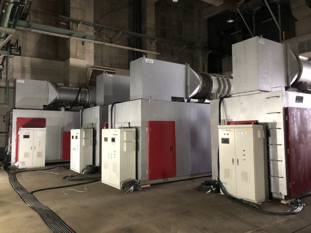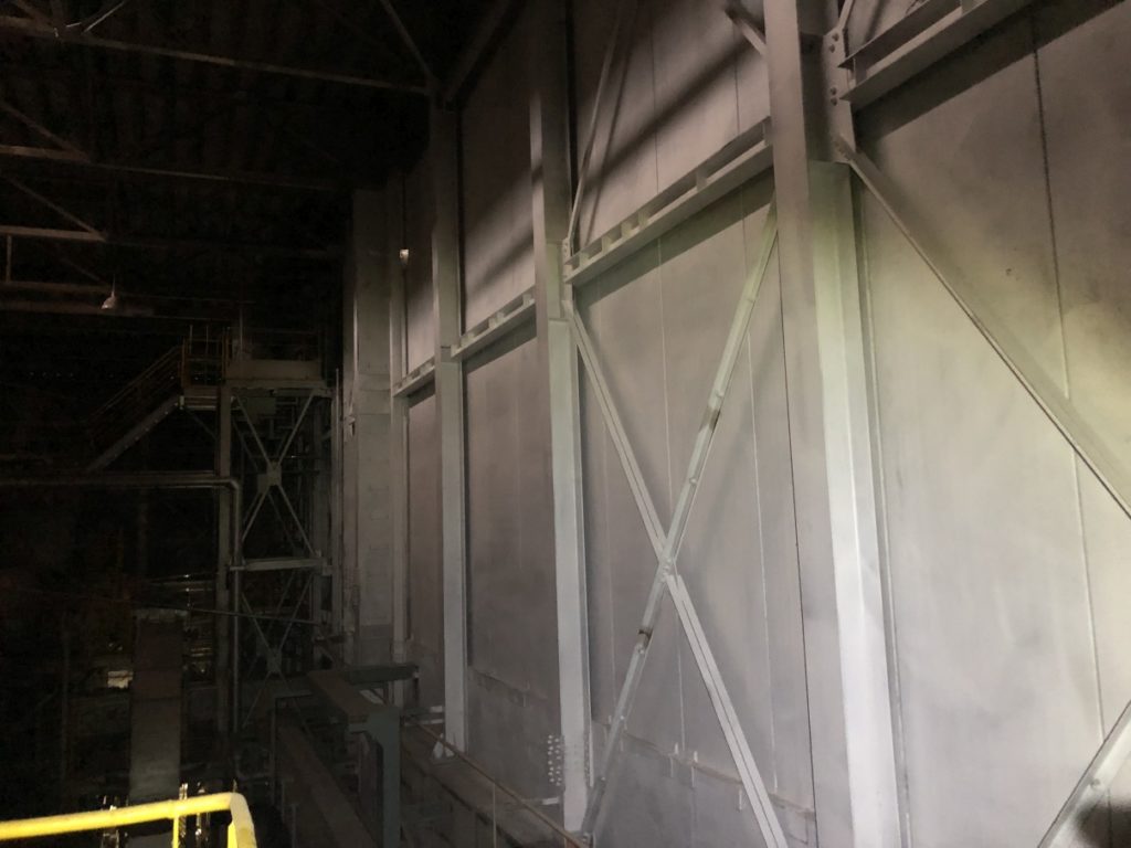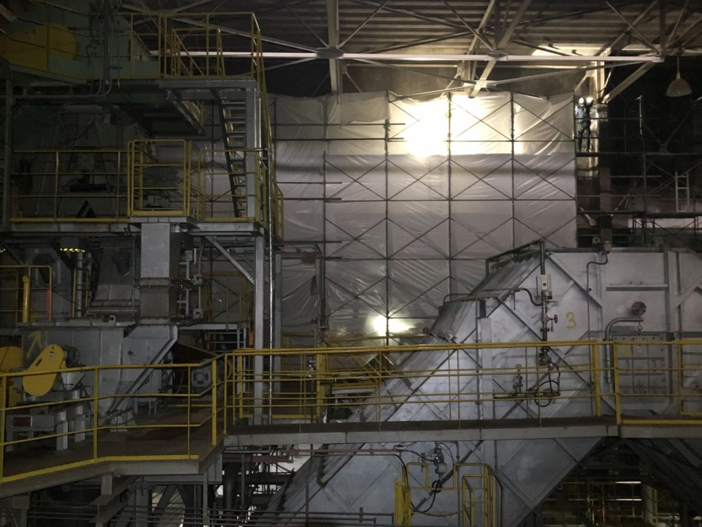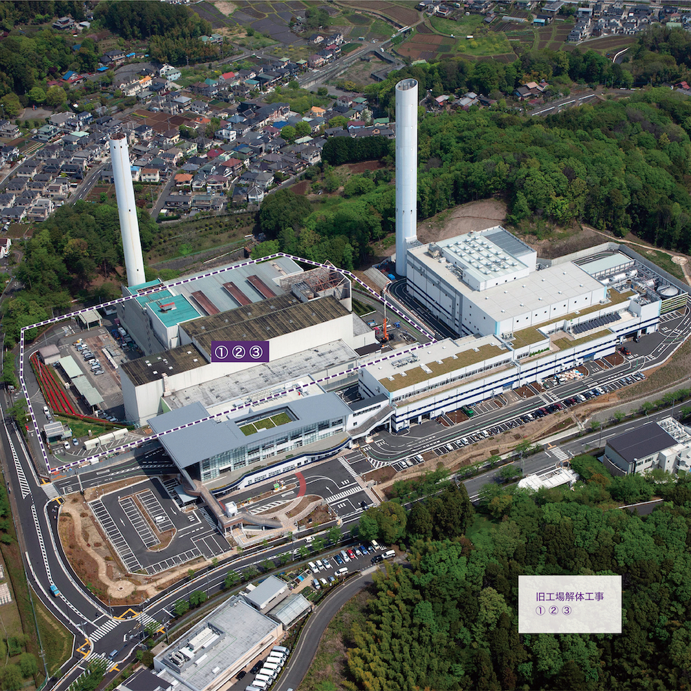 2022.05.15 現場写真 現場状況(2022年4月) ①旧工場解体工事状況(4月下旬)(焼却炉室内部の耐火被覆材(アスベスト含有)の除去工事を行いました) ①旧工場解体工事状況(4月下旬)(耐火被覆材の除去完了後の様子です) ②旧工場解体工事状況(4月下旬)(プラットホーム上部の内装解体工事を行いました)③旧工場解体工事状況(4月下旬)(ダイオキシン除去の仮設工事(負圧集じん機の設置)を行いました)