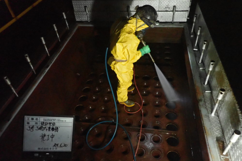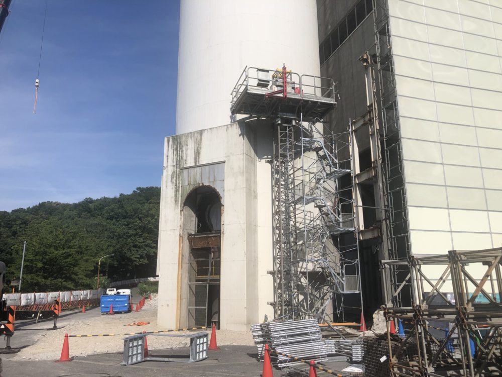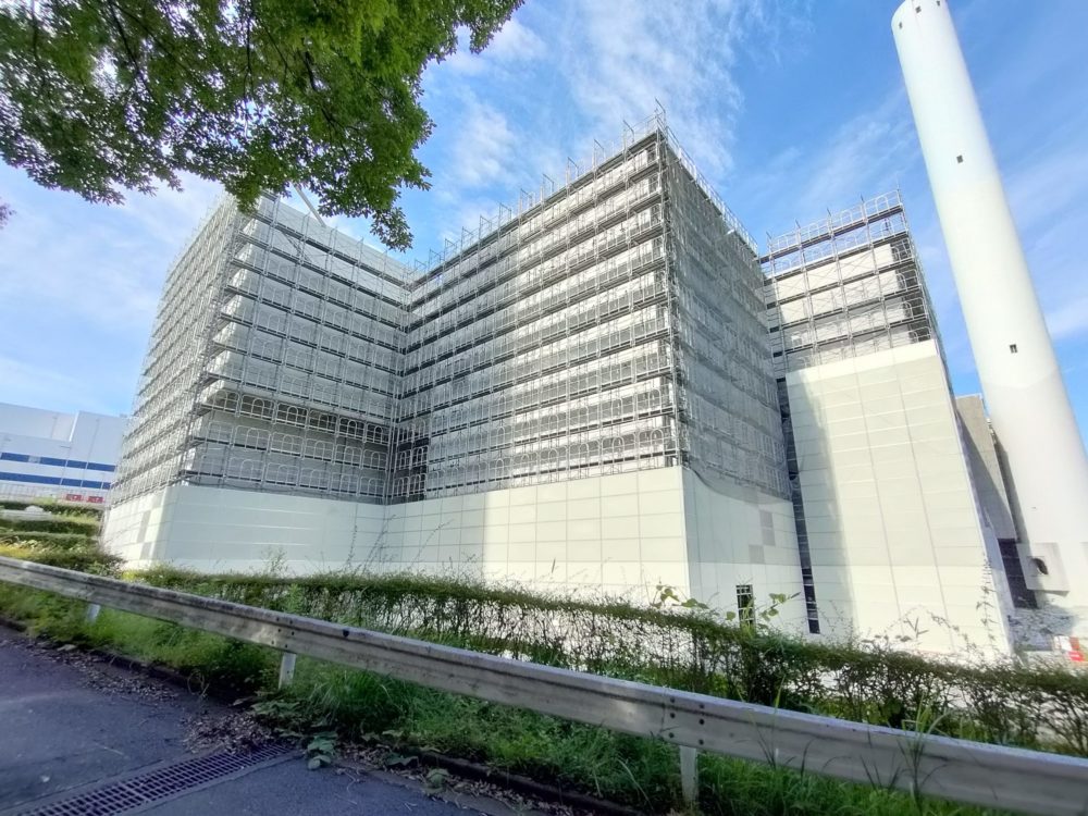 2022.07.21 現場写真 現場状況(2022年6月) ①旧工場解体工事状況(6月下旬)(外観の様子です) ②旧工場解体工事状況(6月下旬)(煙突解体用足場の組立を行いました) ③旧工場解体工事状況(6月中旬)(ダイオキシン除去(機器の洗浄)作業を行いました)③旧工場解体工事状況(6月中旬)(ダイオキシン除去(機器の洗浄)作業を行いました)