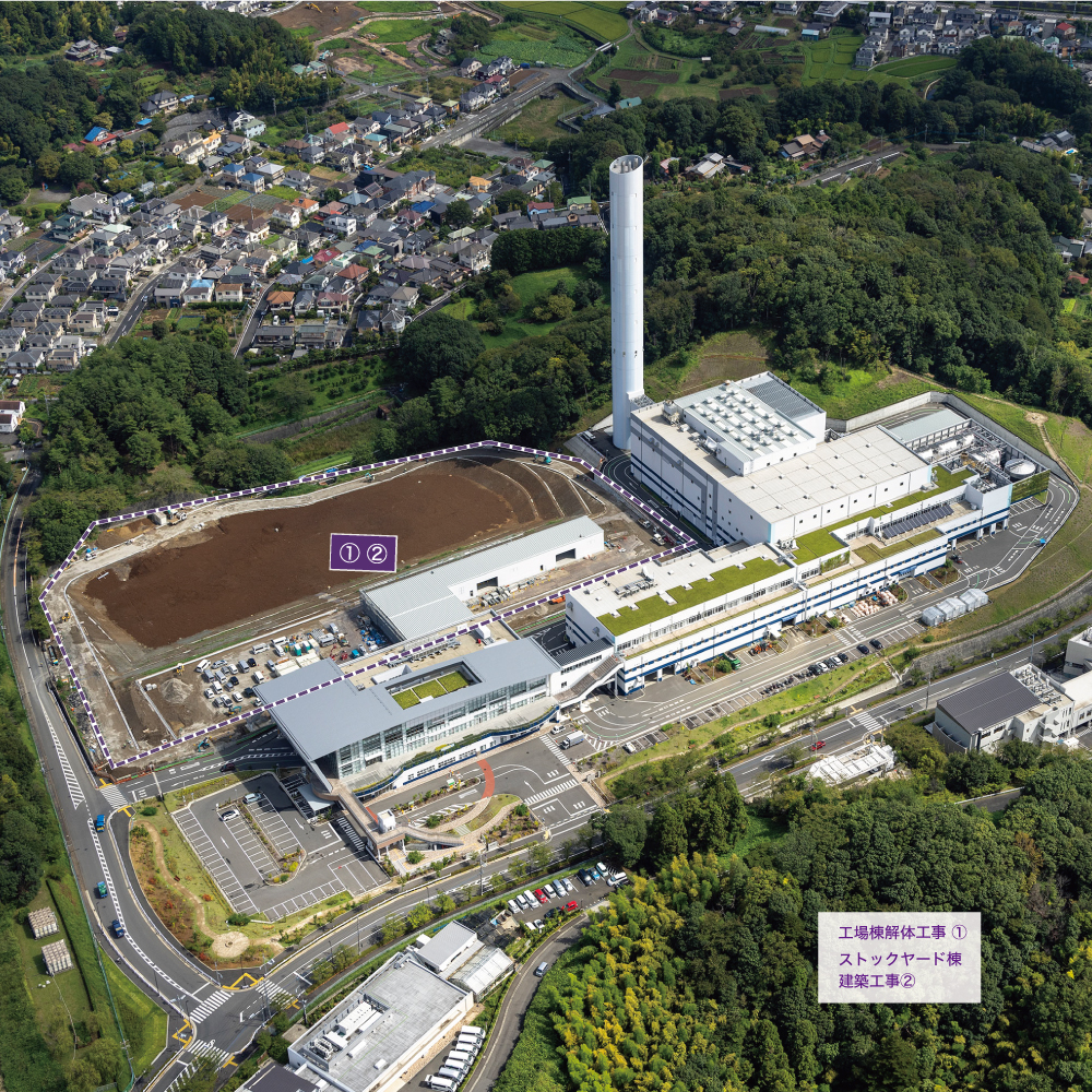 2024.10.2 現場写真 現場状況(2024年8月) ①造成工事状況(8月上旬)(外構部の道路工事を行いました)①造成工事状況(8月下旬)(外構用植栽の搬入を行いました)②ストックヤード棟建築工事状況(8月上旬)(外装仕上げ工事を行いました)②ストックヤード棟建築工事状況(8月上旬)(外装仕上げ工事を行いました)